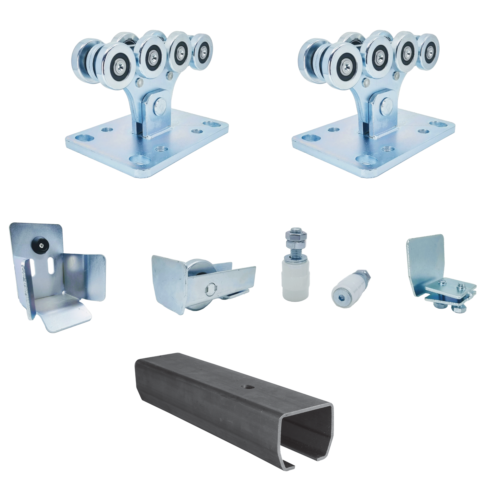Sestava pro samonosné posuvné brány do 350kg. Vše co potřebujete pro zhotovení kvalitní samonosné posuvné brány bez pohonu.