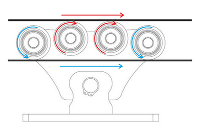 - narozdíl od 2 a 4 ložiskových vozíku nedochází ke smyku (ložisko běží na dolní i horní stěně, k jedné ze stěn tedy běží v protisměru)