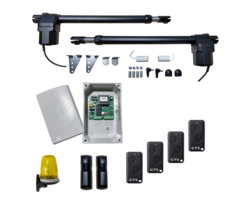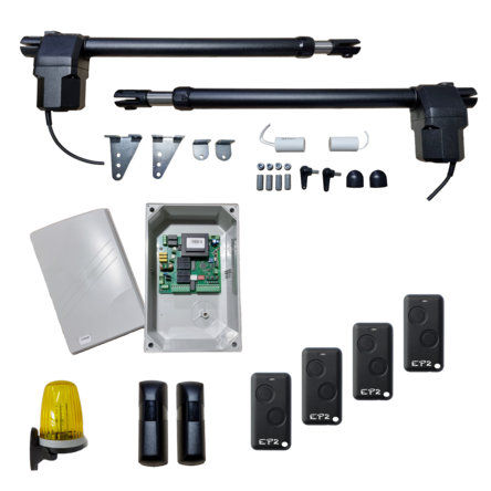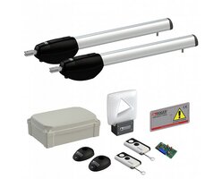 Kompletní sada pohonu pro křídlovou bránu max. šířka křídla 4m do hmotnosti jednoho křídla 350kg. Pohony jsou napájeny 230V. Velmi kvalitní pohon křídlové brány, jehož tělo je vyrobeno ze slitiny hliníku. Pístnice pohonu je vyrobena z nerezové oceli, uvnitř které je uložena ocelová šroubovice pohonu. Pohony jsou vybaveny mechanickým odblokováním pomocí odblokvacího klíče v případě výpadku proudu.