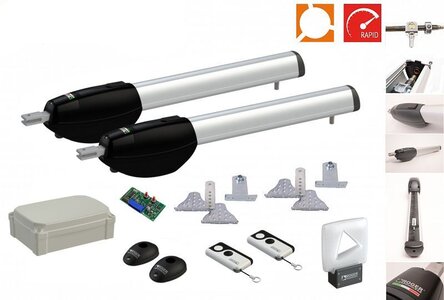 Originál sada pohonu s příslušenstvím od ROGER TECHNOLOGY!! Sada High speed pohonu pro super intenzivní provoz. Kompletní sada pohonu pro křídlovou bránu. Určeno až pro velmi intenzivní provoz. Pohony brány lze použít jak pro otevírání dovnitř, tak pro otevírání směrem ven.
